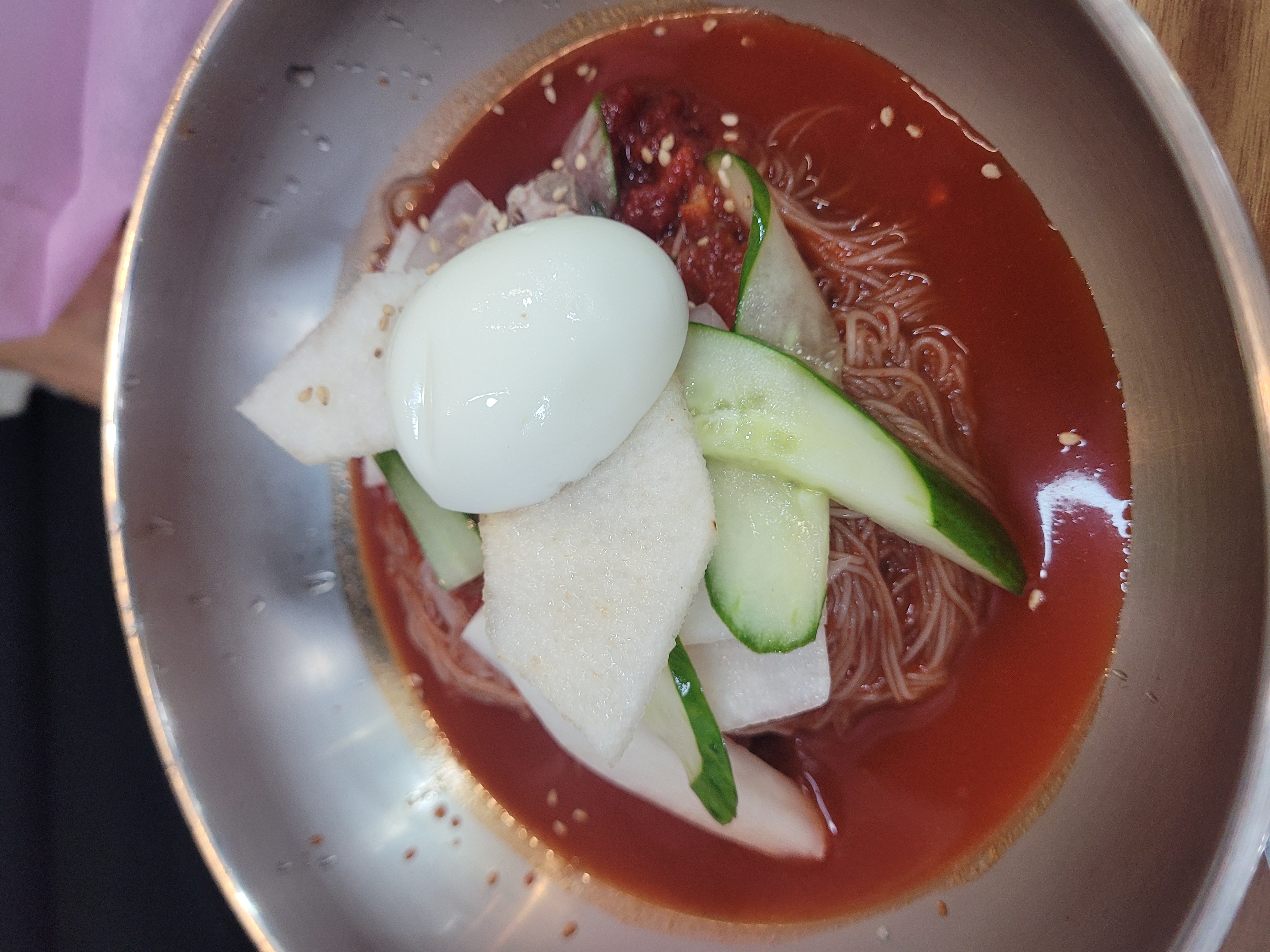 ③ 온육수 (서비스 그 이상) 냉면집에서 주는 따뜻한 육수, 다들 아시죠? 그런데 여기 온육수는 그냥 면수 수준이 아닙니다. 진하게 우린 고기 육수에 파와 김가루를 띄워주는데, 냉면의 매운맛을 중화시켜주면서 속을 뜨끈하게 데워줍니다.
