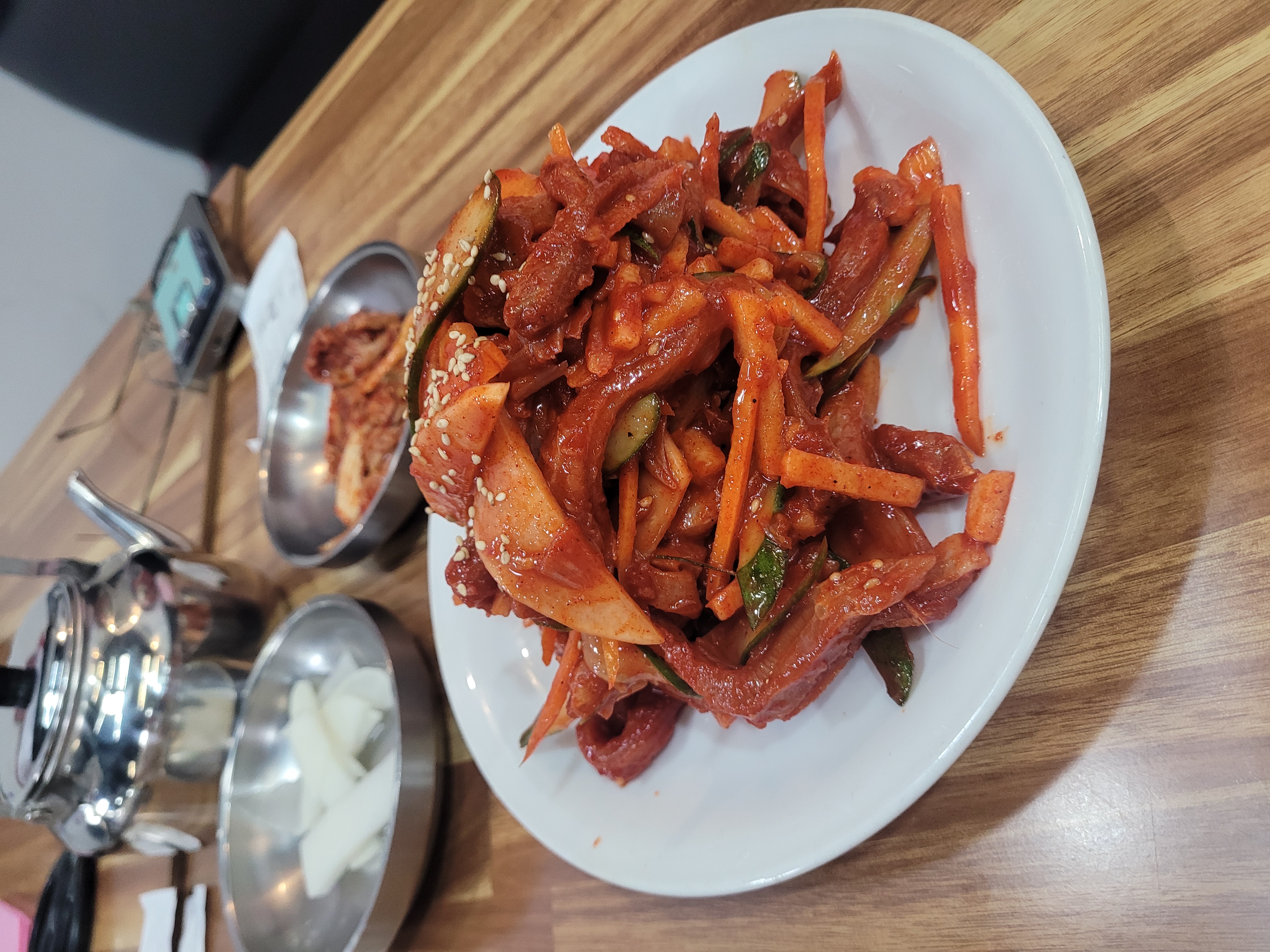 ② 가오리회무침 (최고의 술안주) 이날의 하이라이트였습니다. 비빔냉면이 식사라면, 가오리회무침은 완벽한 메인 요리였습니다. 가오리 특유의 꼬들꼬들한 식감과 부드러운 결이 살아있고, 새콤·매콤·달콤한 양념의 삼박자가 완벽했습니다. 친구와 이야기 나누며 두세 젓가락 집어먹다 보니, 어느새 소주병이 비어있더군요. 결국 "2차 가지 말고 여기서 끝내자"는 합의를 볼 정도였습니다.