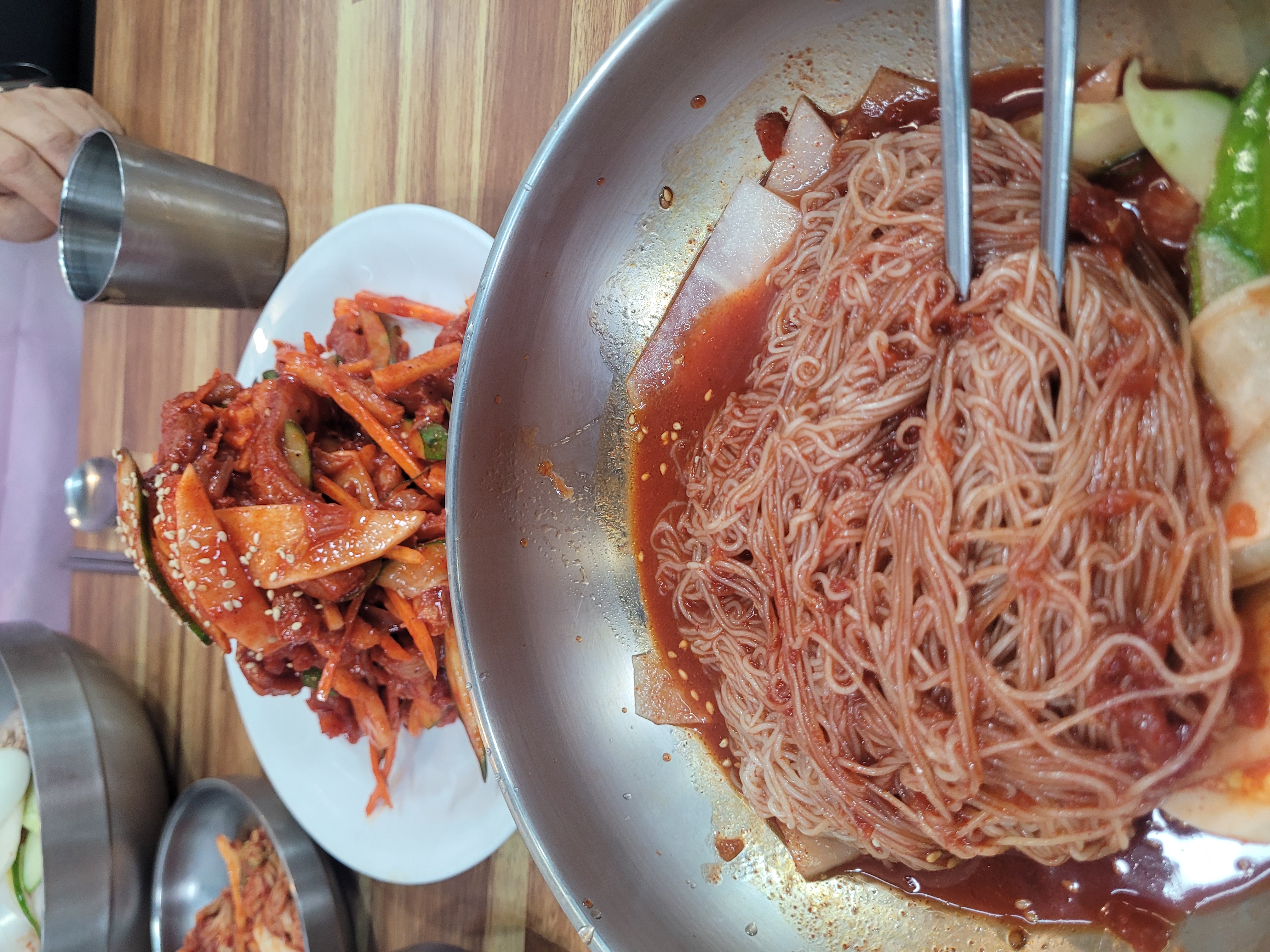 ① 비빔냉면 (함흥의 정석) 함흥냉면의 생명은 역시 면발이죠. 이곳의 면은 얇으면서도 탄력이 살아있어 씹는 맛이 일품이었습니다. 무엇보다 양념장이 예술입니다. 너무 맵기만 한 게 아니라, 적당히 매콤하면서 은은한 단맛이 감돌아 입에 착착 감깁니다. **"한 입 먹고 맥주 한 모금"**이 이날의 공식이 될 정도로 중독성 있는 맛이었습니다.
