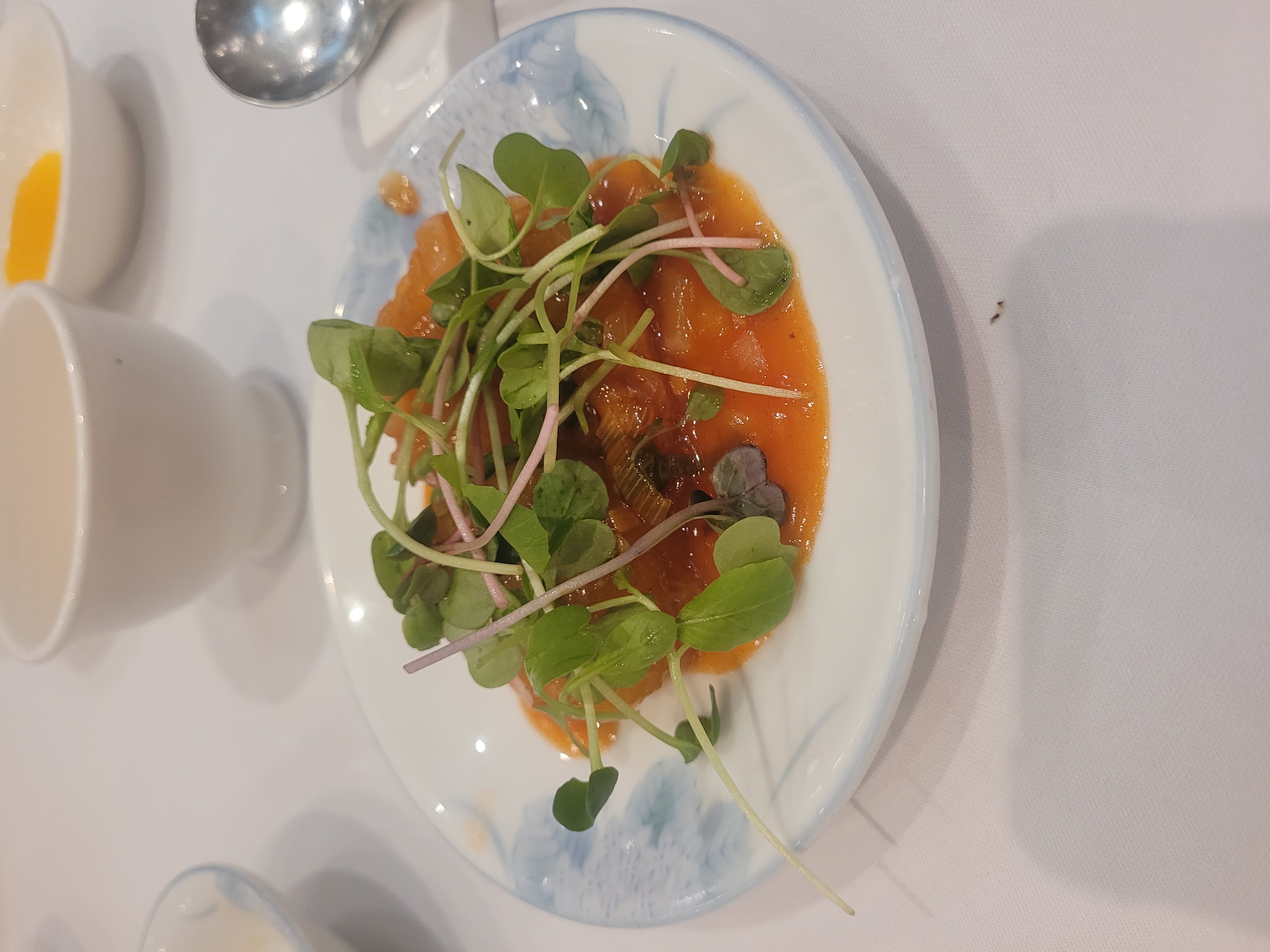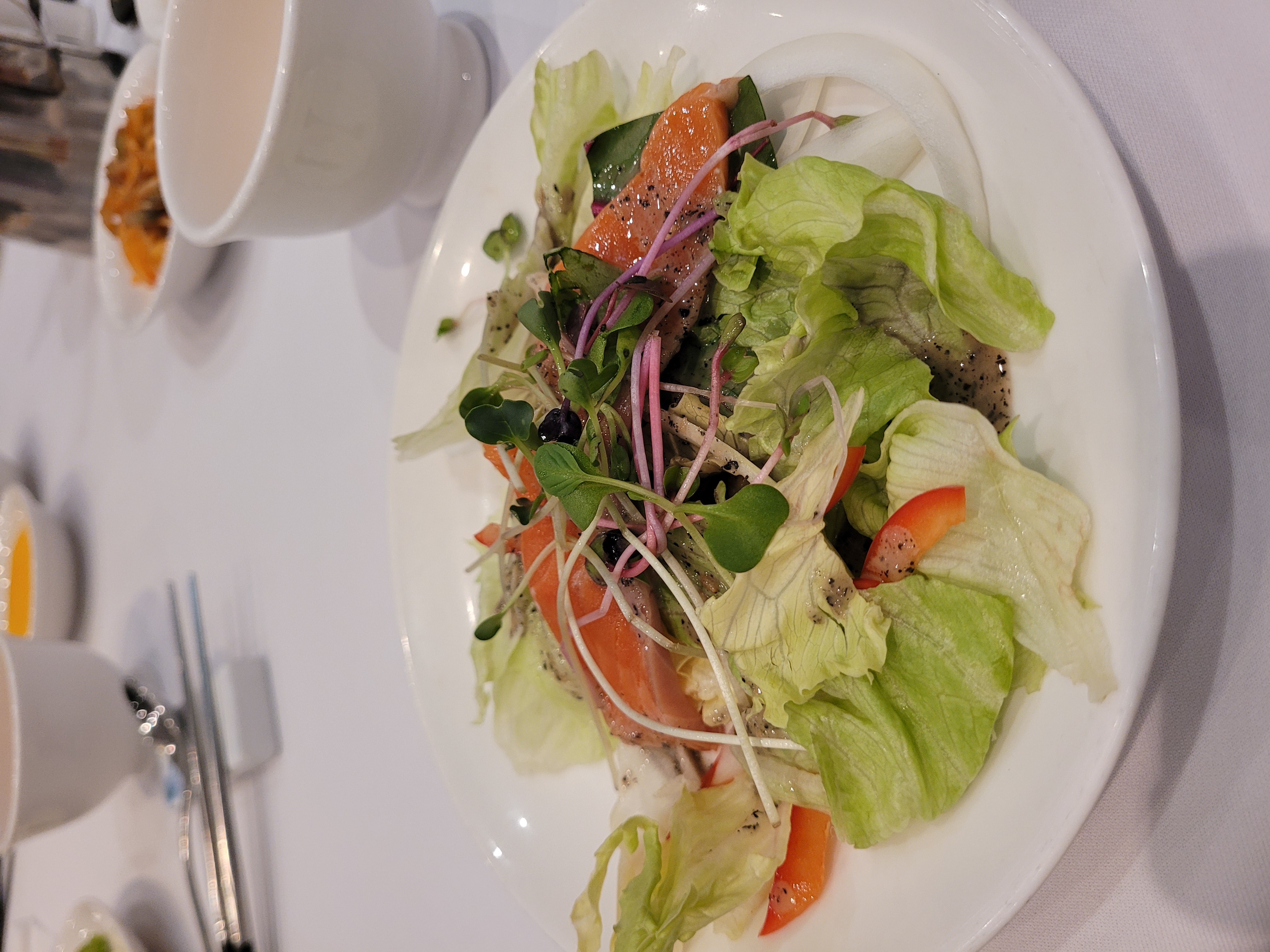 ① 입맛을 깨우는 시작: 연어샐러드 상큼한 드레싱과 신선한 연어가 어우러져 식전 입맛을 돋우기에 충분했습니다.