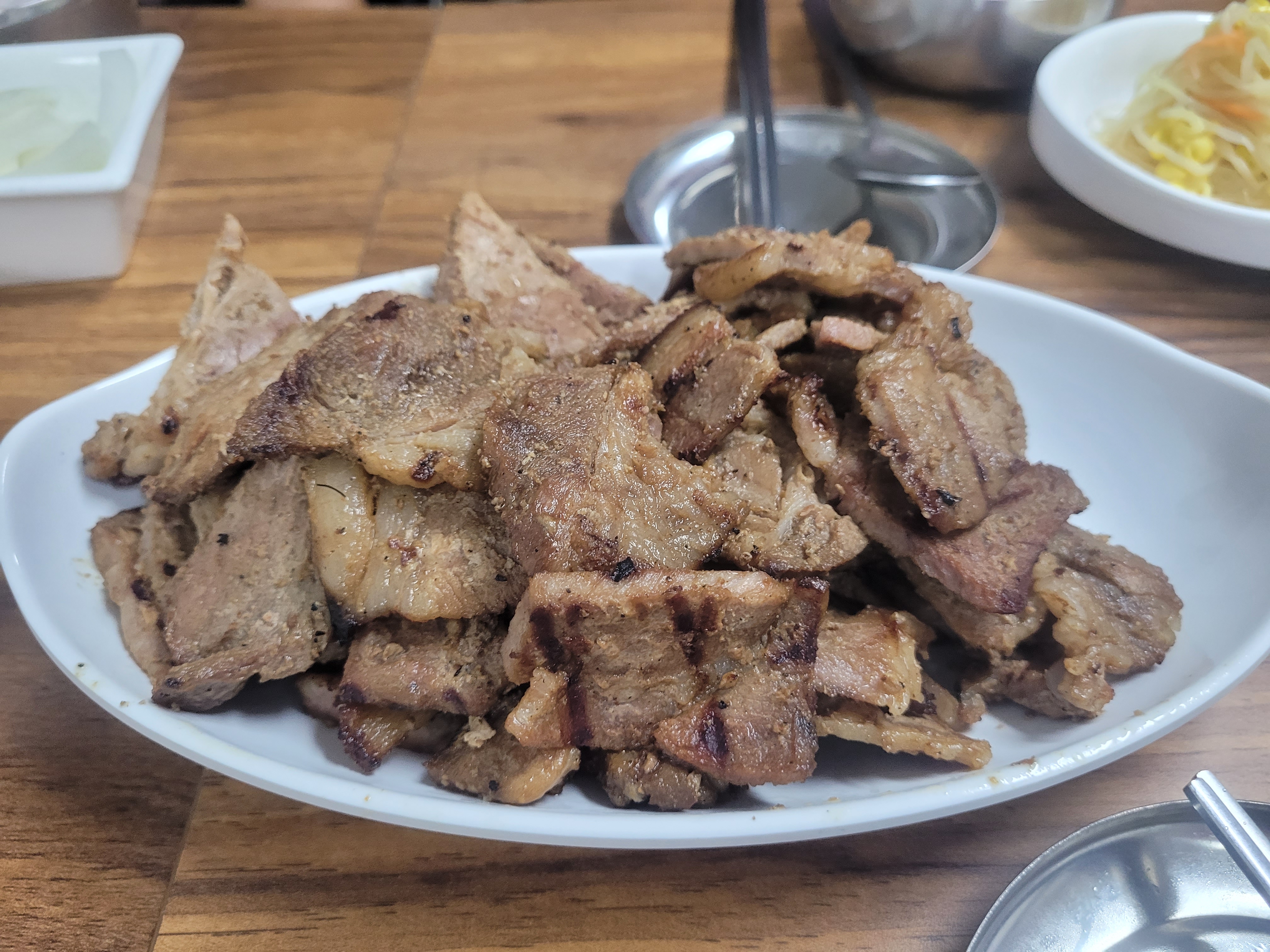 ① 직화구이의 진수 일반 프라이팬에 볶은 제육볶음과는 차원이 다릅니다. 강력한 불에 구워내어 은은한 불향이 고기 깊숙이 배어있습니다. 고기는 질기지 않고 부드러우며, 함께 구워진 양파와 마늘의 달큰함이 고기의 풍미를 한껏 끌어올려 줍니다. 와이프도 한 입 먹자마자 "여보, 여기 찐이다!"라며 감탄하더군요.