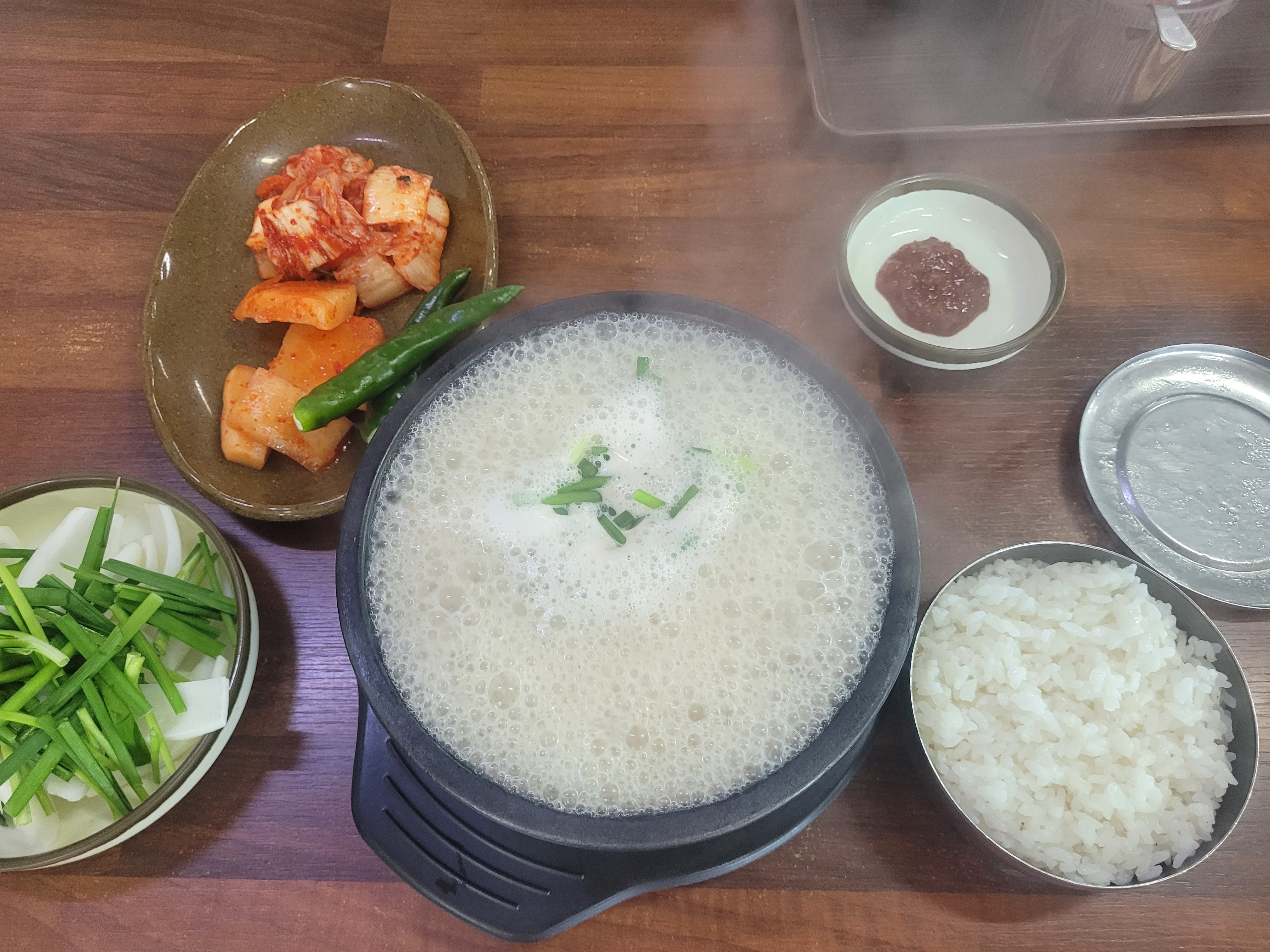 ③ 밑반찬: 셀프바의 매력 국밥집의 생명은 김치와 깍두기죠. 셀프 코너가 잘 마련되어 있어 눈치 보지 않고 리필해 먹을 수 있었습니다. 적당히 익은 아삭한 깍두기와 감칠맛 나는 김치는 진한 사골 국물과 환상의 궁합을 자랑했습니다.