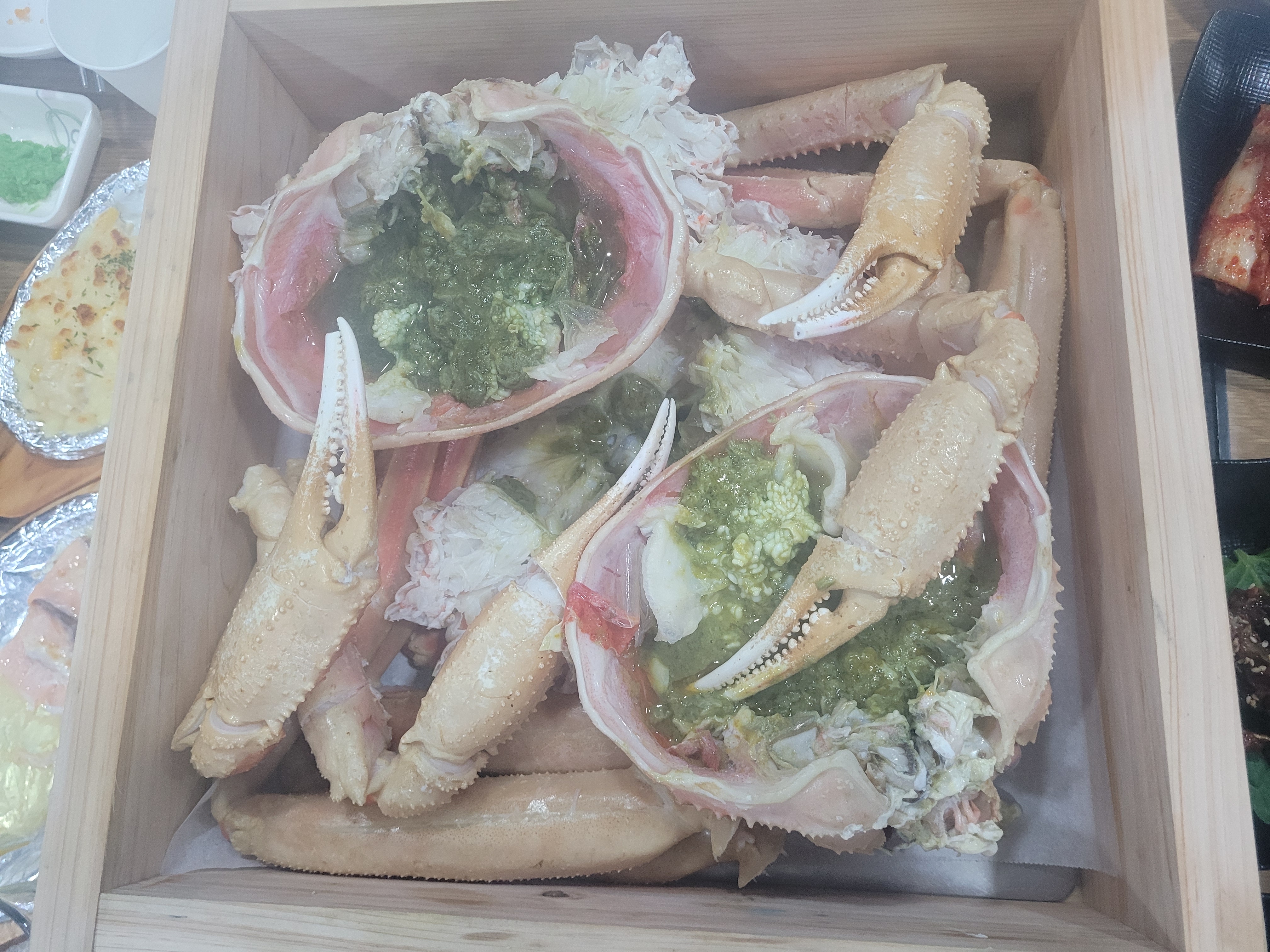 ① 끝까지 따뜻하게, 편백찜기 대게 이곳의 시그니처입니다. 일반 접시가 아닌 편백찜기에 담겨 나와 은은한 편백 향이 배어있고, 식사가 끝날 때까지 대게가 식지 않았습니다. 살수율도 훌륭했습니다. 꽉 찬 다리 살은 씹을수록 단맛이 올라왔고, 녹진한 내장은 감칠맛 그 자체였습니다.