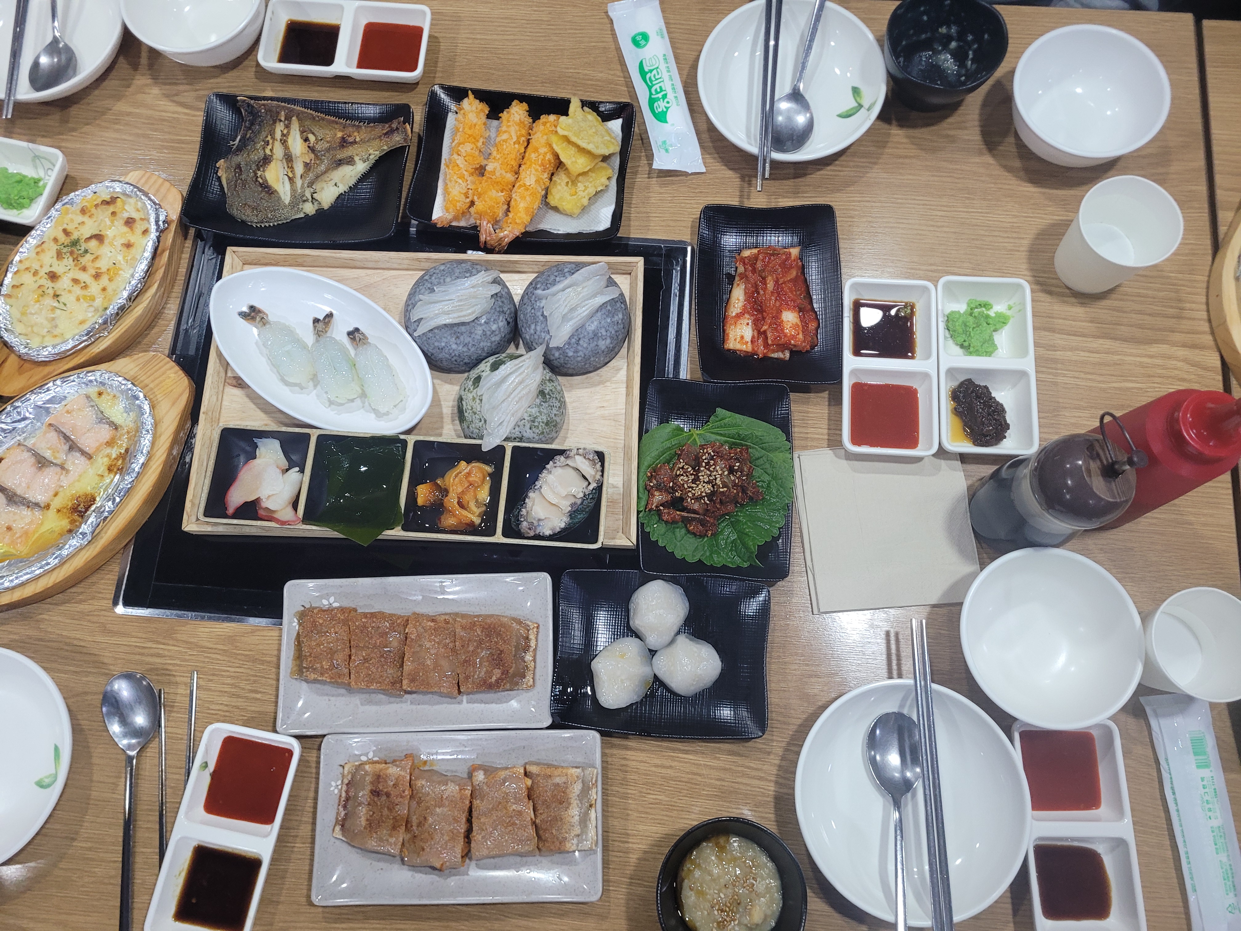 ② 메인 같은 사이드, 모듬회 & 해산물 대게 집에서 나오는 회라 큰 기대 안 했는데, 웬걸요. 광어, 우럭, 연어 등 횟감이 두툼하고 신선해 쫄깃한 식감이 살아있었습니다. 멍게, 해삼, 전복 등 해산물 4종도 바다 내음 가득했습니다. 예약 서비스로 받은 가리비구이는 버터 풍미가 가득해 술안주로 최고였습니다.
