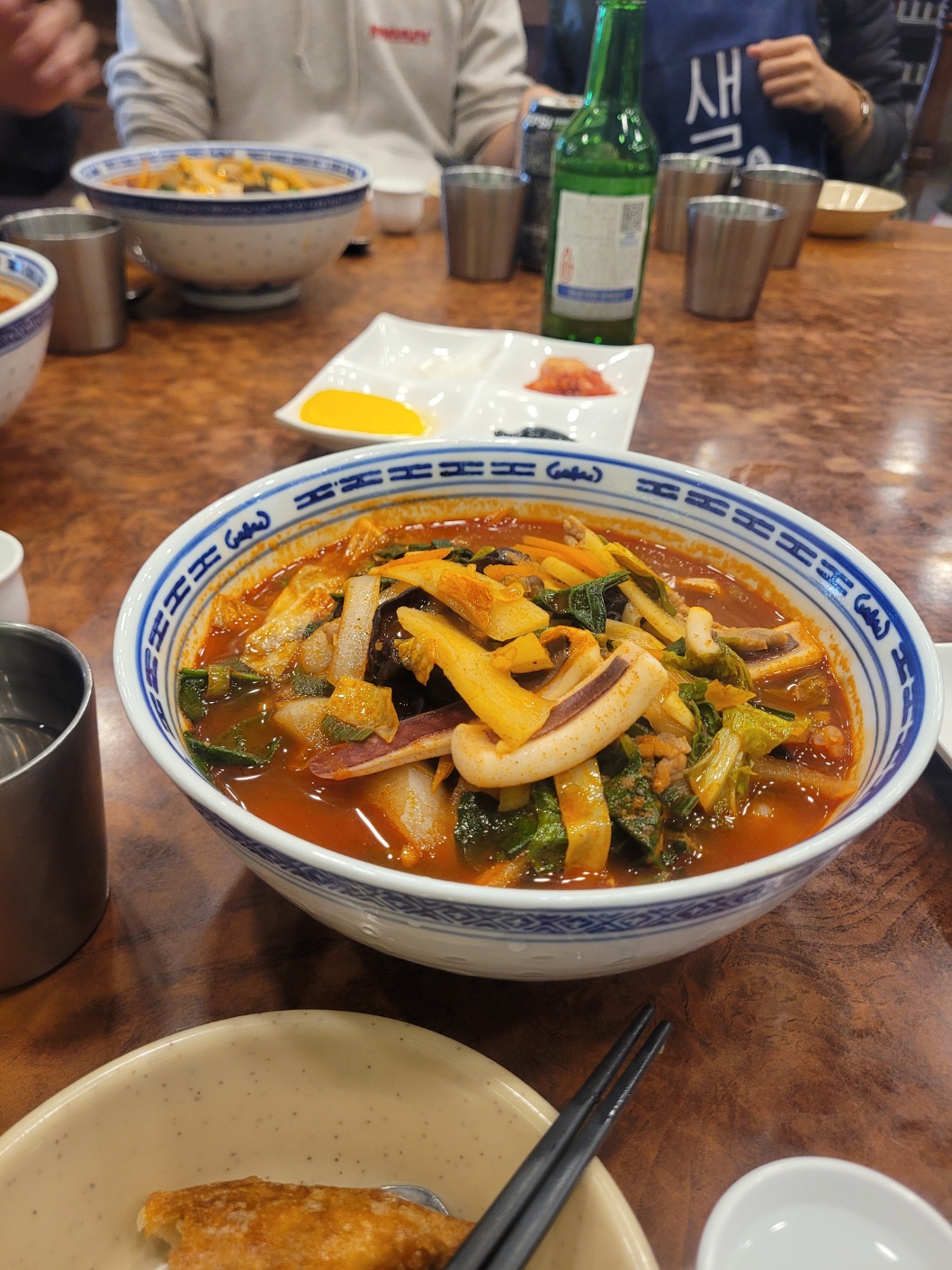① 국물: "크으~" 소리가 절로 나는 맛 첫 국물을 뜨는 순간, 일행 모두 약속이나 한 듯 감탄사를 내뱉었습니다. 고기 육수의 묵직함보다는 해산물 베이스의 시원하고 칼칼한 맛이 강했습니다. 캡사이신의 인위적인 매운맛이 아니라, 속을 확 풀어주는 개운한 매운맛이라 전날 술을 마신 분들에게는 최고의 해장국이었습니다. 오징어, 새우, 주꾸미 등 해산물도 섭섭지 않게 들어있어 씹는 맛을 더했습니다.